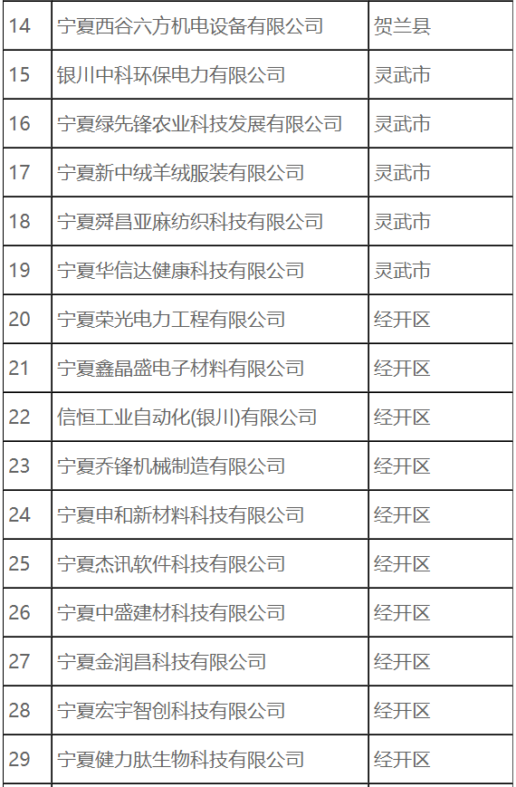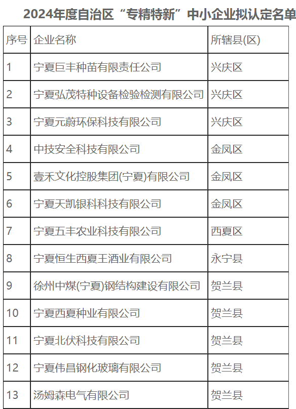 根据工信部《优质中小企业梯度培育管理暂行办法》(工信部企业〔2022〕63号)、《自治区优质中小企业梯度培育管理实施细则》(宁工信规发〔2022〕4号)和《自治区中小企业高质量发展专项资金管理办法》(宁财规发〔2023〕5号)规定,经自治区创新型中小企业自愿申报、县级中小企业主管部门初审、五市及宁东复审推荐、自治区审核汇总、专家审查评审、合规性审核、实地核查、党组会议研究等程序,现将2024年度自治区“专精特新”中小企业拟认定名单予以公示,欢迎社会各界参与监督。
