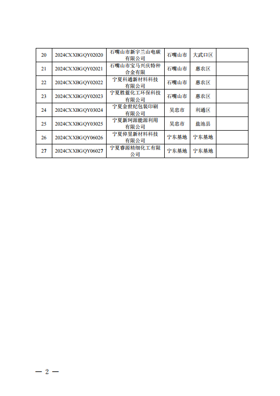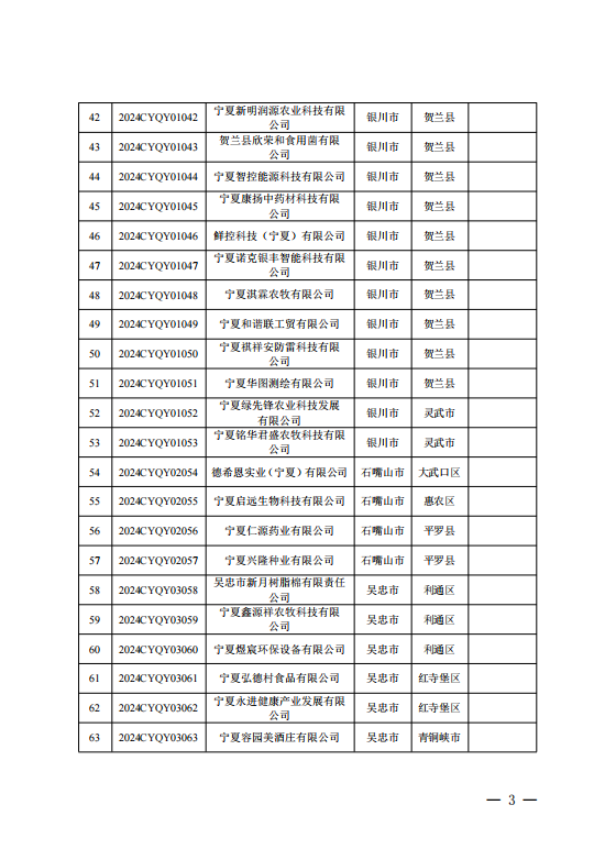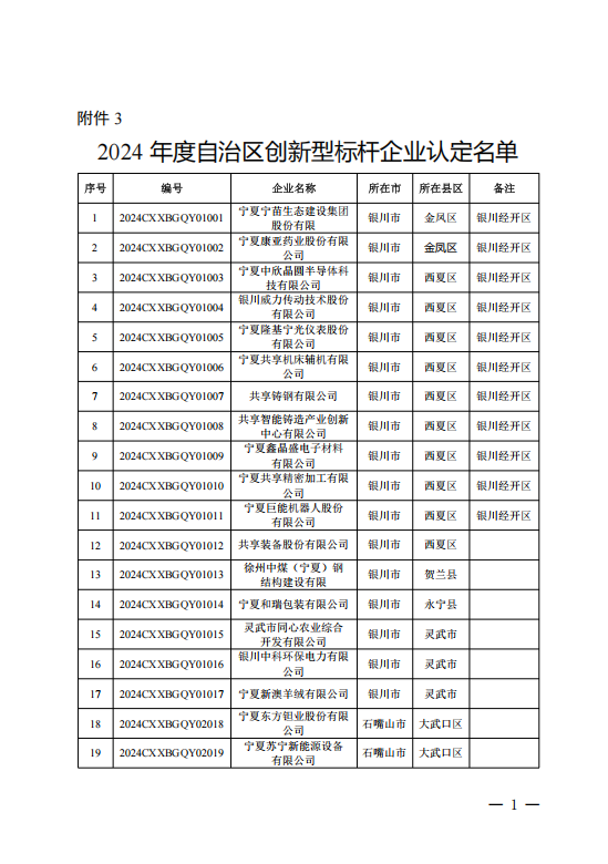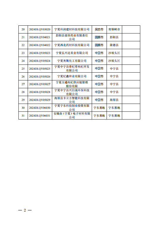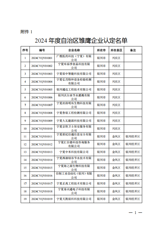 根据自治区雏鹰企业、瞪羚企业和创新型标杆企业认定管理有关规定,决定认定广煜医药科技(宁夏)有限公司等80家企业为2024年度自治区雏鹰企业,宁夏华晟节能环保科技有限公司等31家企业为2024年度自治区瞪羚企业,宁夏宁苗生态建设集团股份有限公司等27家企业为2024年度自治区创新型标杆企业,上述企业资格有效期三年。